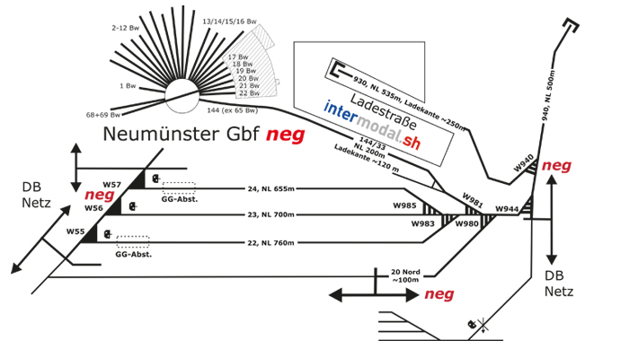 ist der Umschlag von Massengütern und intermodalen Ladeeinheiten möglich. Flächen für eine Zwischenlagerung stehen nach Rücksprache zur Verfügung. Einzelheiten zur Kapazitätsverwaltung gemäß EBRegG klären Sie bitte mit uns im Gespräch. Unser Fahrdienstleiter ist zu den verwaltungsüblichen Zeiten unter +49 4661 980 88-87 erreichbar.